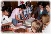 Am 8. 9. 2007 Mit vereinten Kräften wickelten Kambodschaner und deutsche Mitglieder des VOR ORT Unmengen von Frühlingsrollen für die anstehende Agenda in Brühl am 8. 9. von 10 bis 16 Uhr. Das Essen am VOR ORT - Stand war in den letzten Jahren immer eine der Hauptattraktionen unter den vielen Ständen. Frau Sy, Frau Cham und Ay Kheng weihten ihre deutschen Mitstreiterinnen in die Tricks der asiatischen Küche ein. |